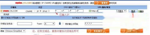 ①.主机名必须填写,用@可以表示主机名为空 ②.选择解析记录类型为A记录;③.输入IP(该IP以实际为准,此处仅供参考);④.增加次级域名